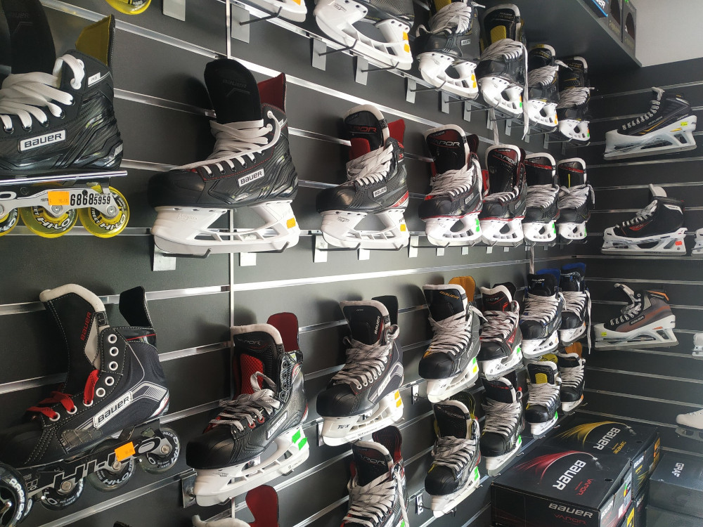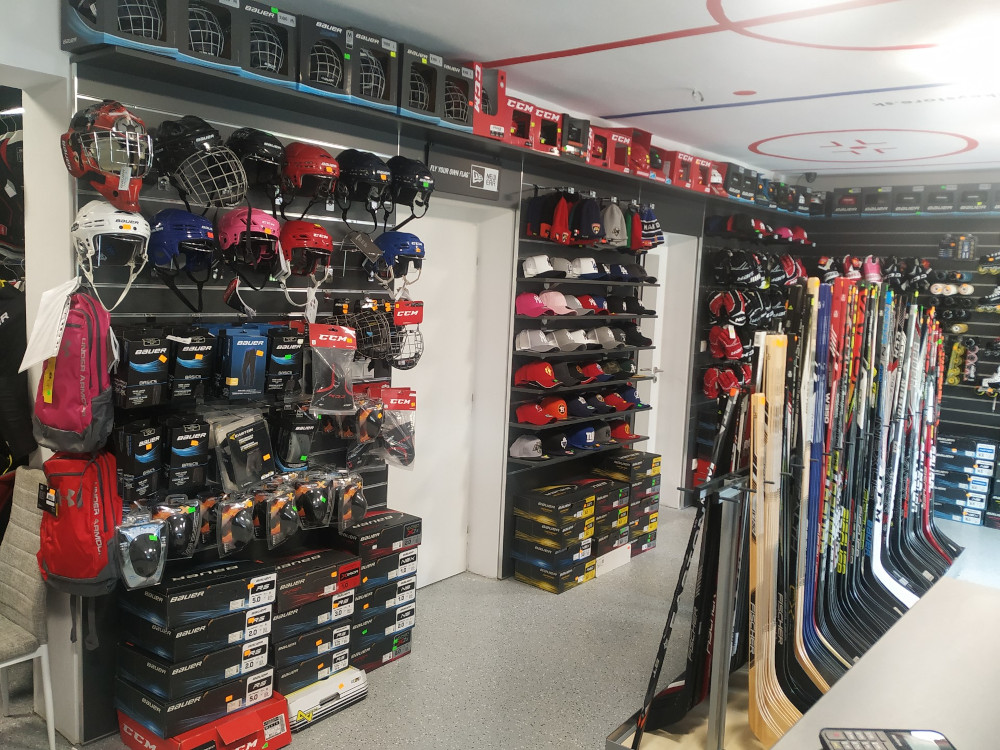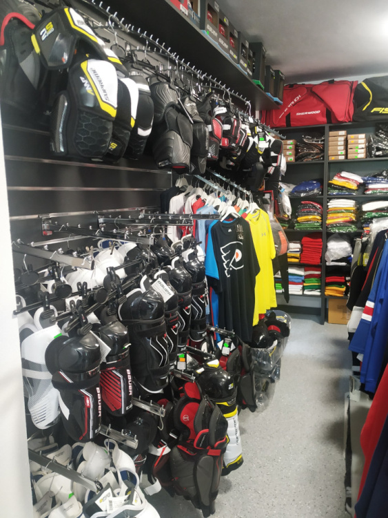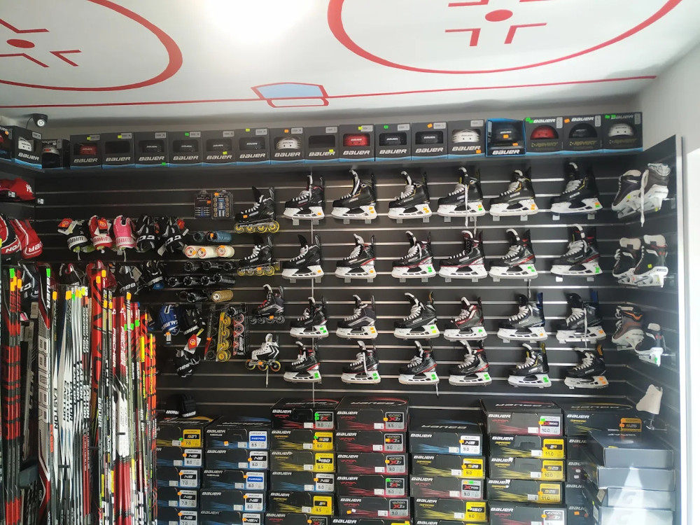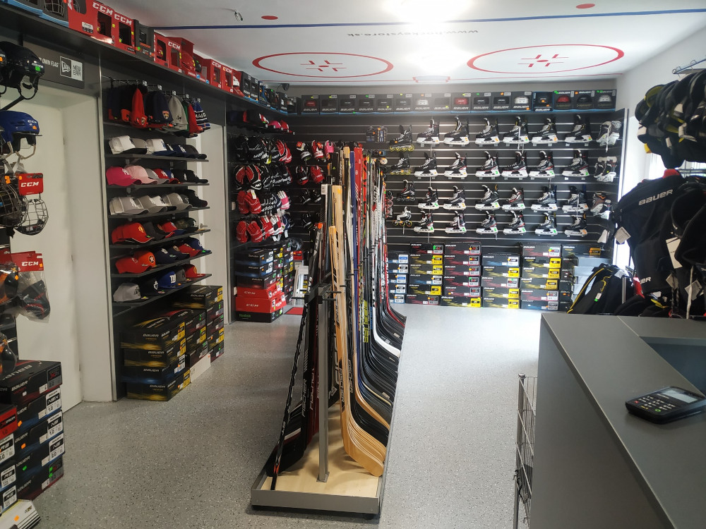 Priamo v predajni máme vystavený široký sortiment - hokejovú výstroj pre hráčov aj hokejovú výstroj pre brankárov od značiek BAUER, CCM, FISCHER, VAUGHN či New Era. Vždy u nás nájdete hokejové korčule, hokejky, rukavice, nohavice, prilby, chrániče ramien, lakťov a holení, ktoré si môžete priamo vyskúšať a porovnať. Doplnkovou súčasťou sú aj hokejové tréningové pomôcky, hokejové puky, bránky, píšťalky, fľaše, čepele či florbalové shafty a detské hokejové sety.